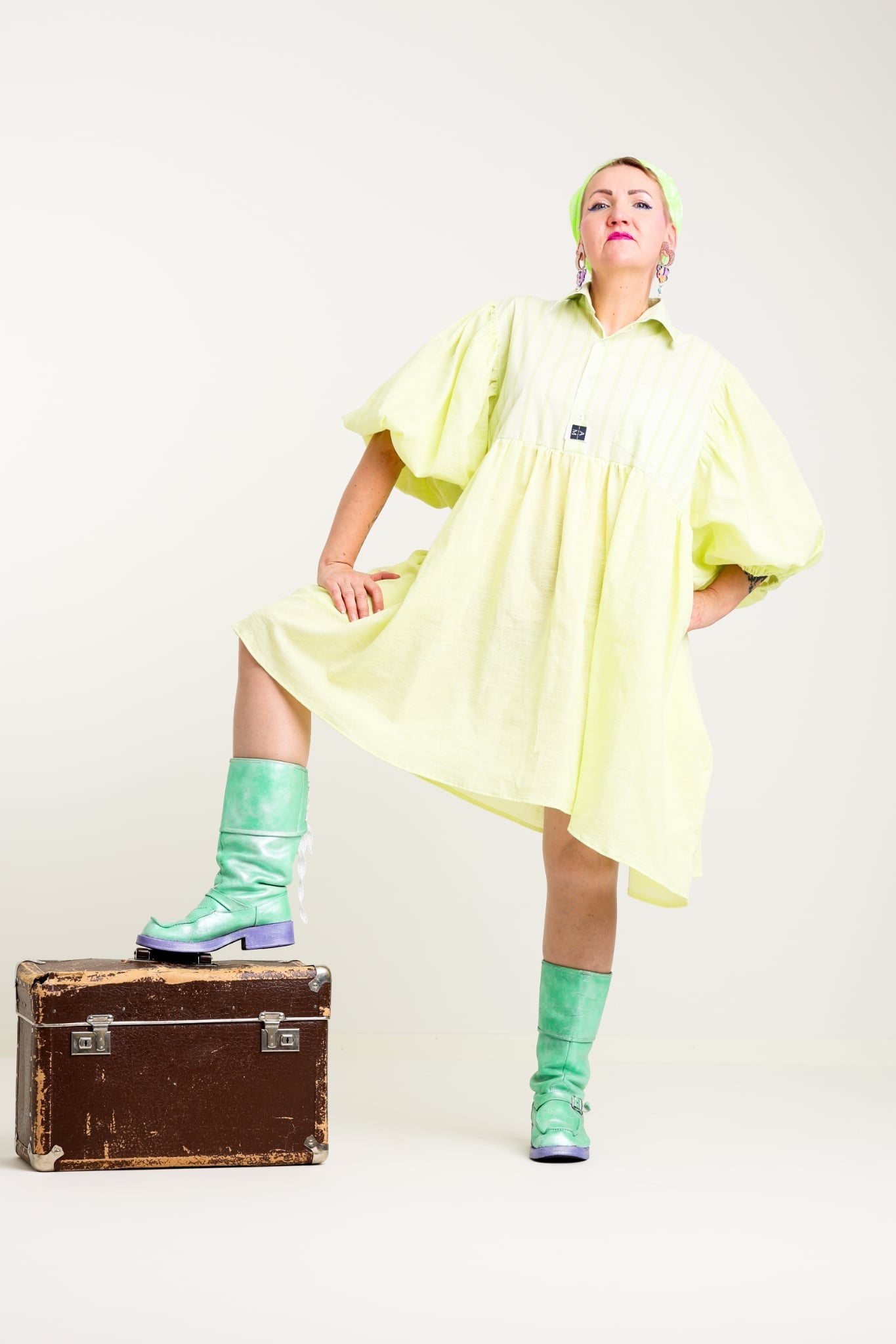 Koska materiaalit ovat kierrätettyjä, vaatteen koko syntyy usein siitä, paljonko kangasta on saatavilla. Siksi jokainen vaate on uniikki ja sen mittasuhteet kertovat aina myös materiaalin tarinaa.